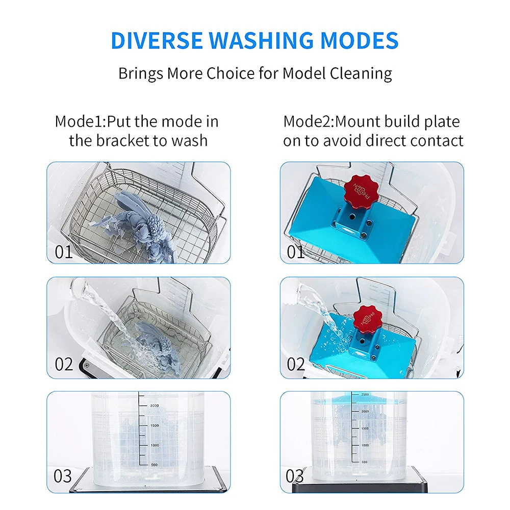 Two Washing Modes: A. Basket washing, remove the model and put it into the basket for direct cleaning; B. Suspension washing, directly hang the print platform on the basket or cleaning stand to clean, reducing exposure to resin