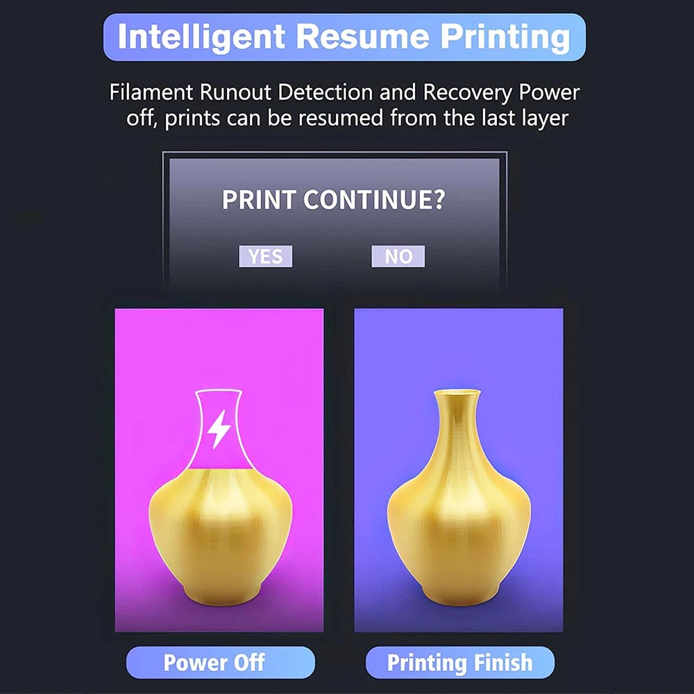 Resume Printing – Filament runout and power failure detection, can resume your printer after recovery. Saving your time and reducing waste