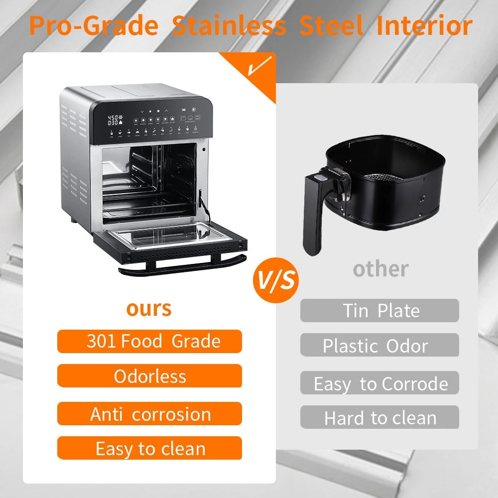 Coupled with an NTC temp probe and PID chip algorithm, our smart air fryer convection oven owns a top-performing smart temperature control system, which ensures a precise and stable temperature through the cooking process by 100 times per second temp, checking to deliver crispy and juicy food.