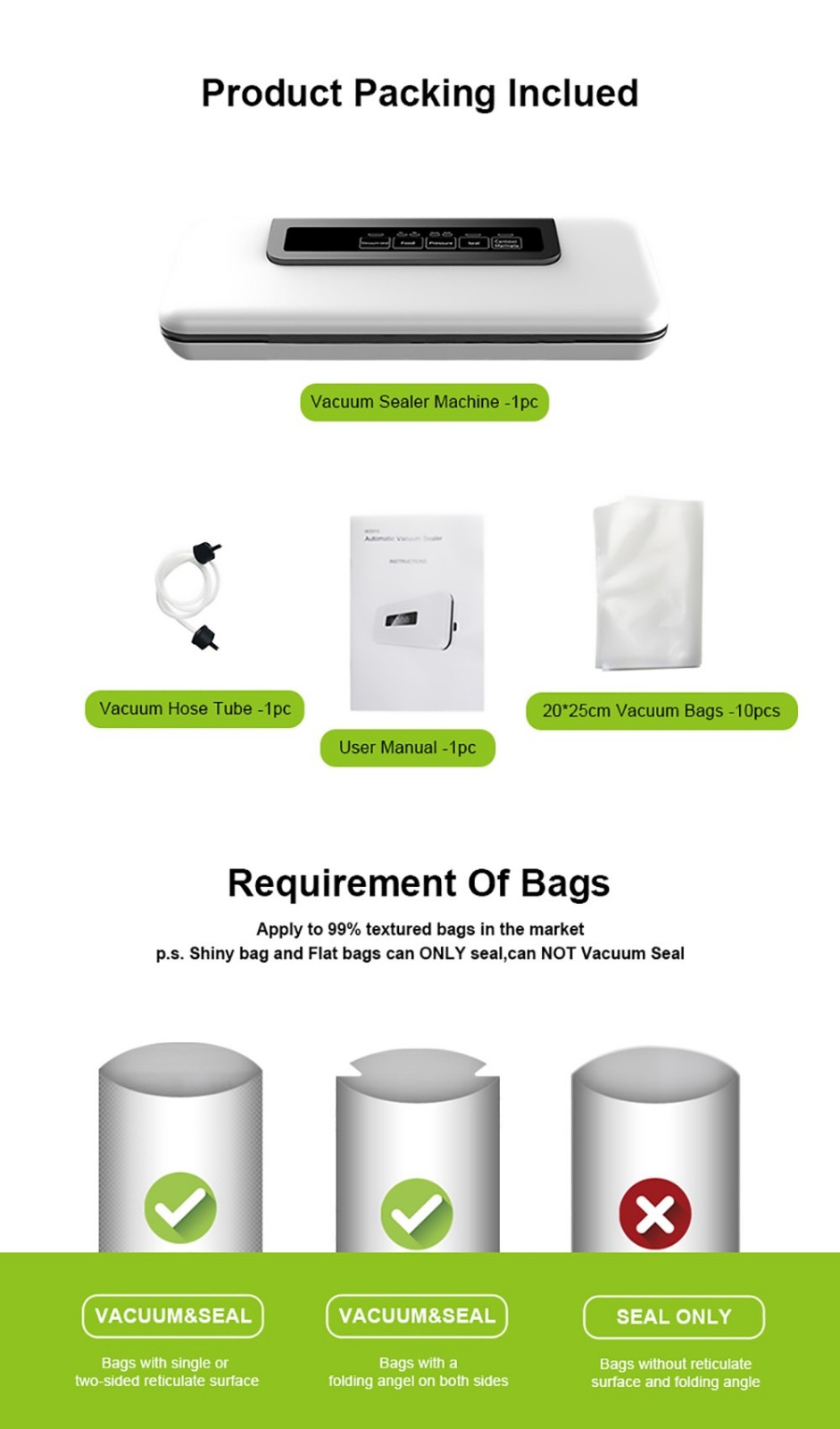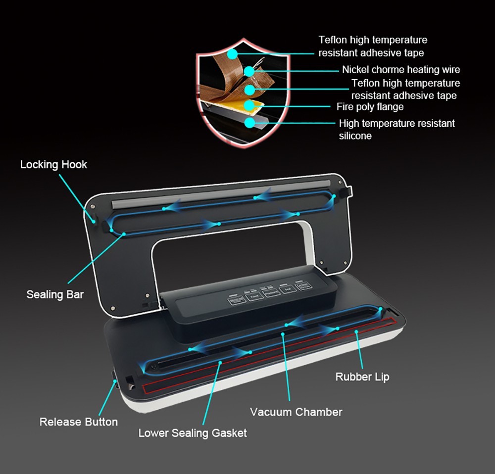 Fully automatic simple electric plug-in design with the control center placed on the top panel and soft touch digital buttons along with LED indicator lights. BioloMix W300 vacuum sealer is a smart device for your family.