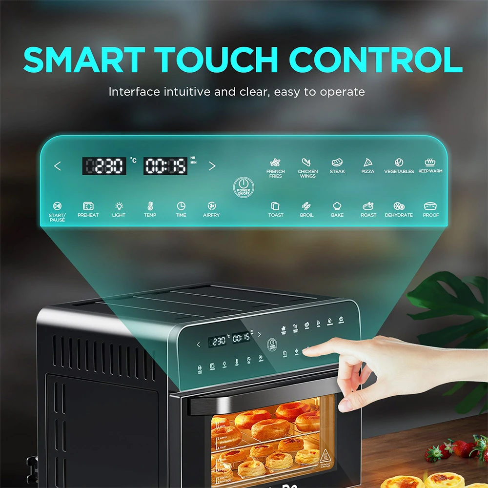 1800W air fryer toaster oven generates surround 360-degree air convection, which helps increases airflow circulation 40% faster, locks in moisture, and avoid food scorching due to uneven heating. It is up to 85% less fat and grease compared with traditional frying, so you can get healthy, safe, and delicious food.