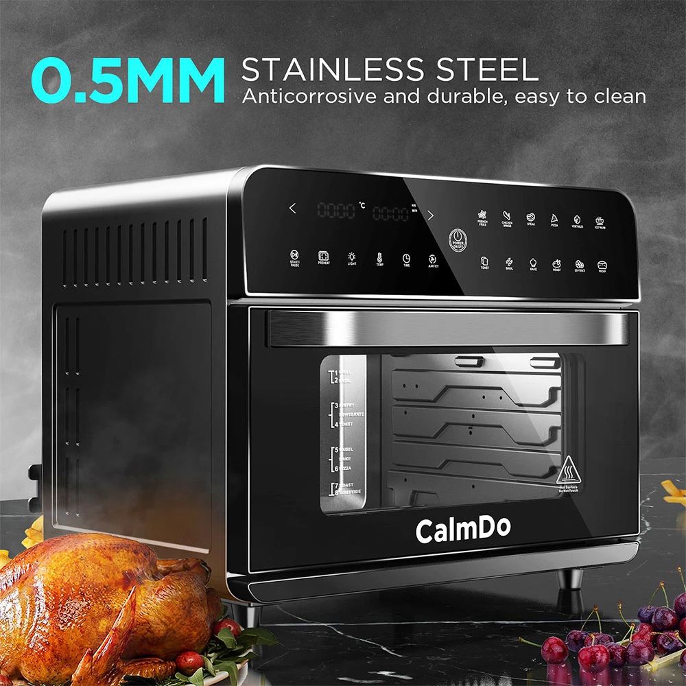 Features 5 times larger than most 5L air fryers on the market, this machine enables you to easily roast a large 10lbs chicken, toast 6 slices of bread, cook a large 2.2 lbs of French fries, 21 chicken wings or bake a 12-inch pizza.