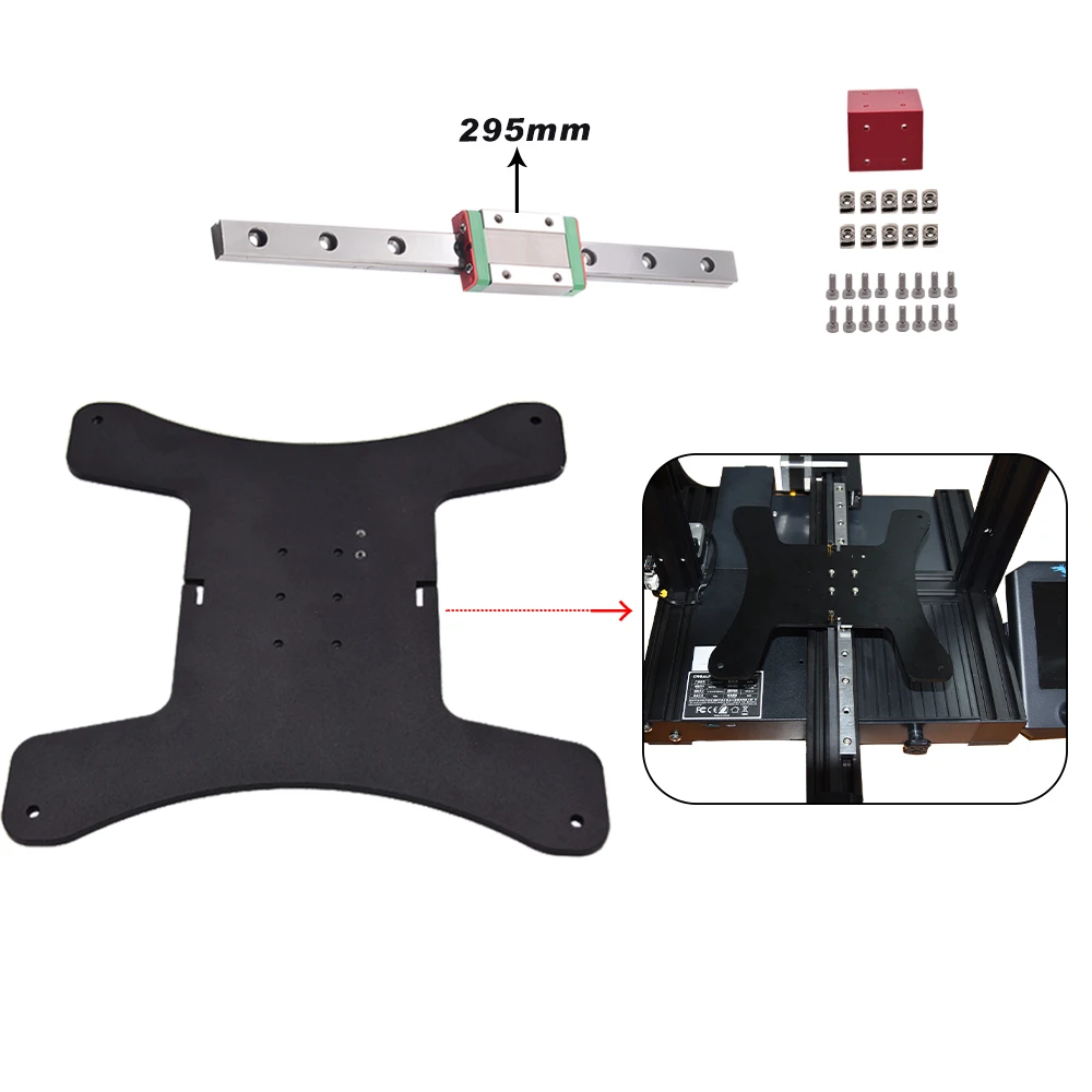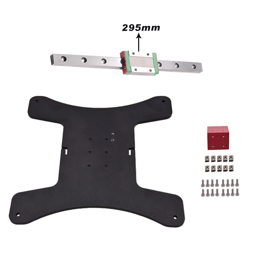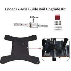 This is a 3D printer Y-axis upgrade kit with linear rail for Ender3/Ender3 V2/Ender 3 PRO. It has a 190*190*4mm hotbed, a 40*40*35mm rail mount, a 295mm linear guide MGN12H, and some installation screws and nuts.