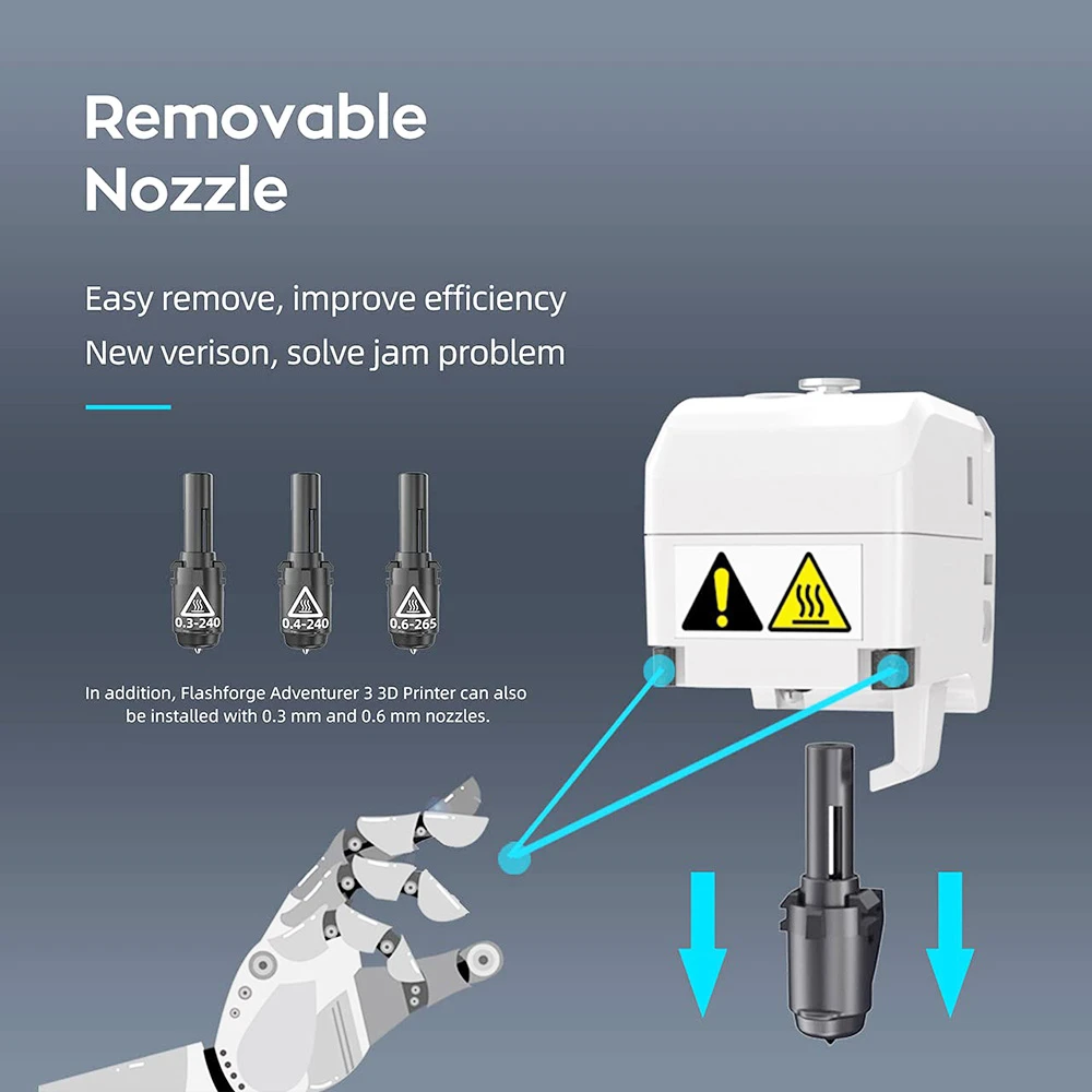 Detachable nozzle & fast heating: remove nozzle from extruder in one push; Stainless steel tube material; Nozzle fast