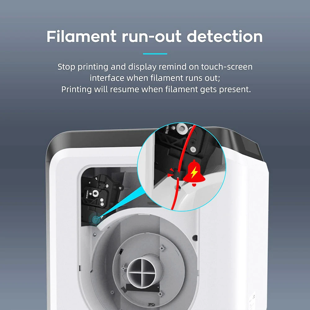 Filament run-out detection stops printing when filament runs out; Printing will resume when filament gets present.