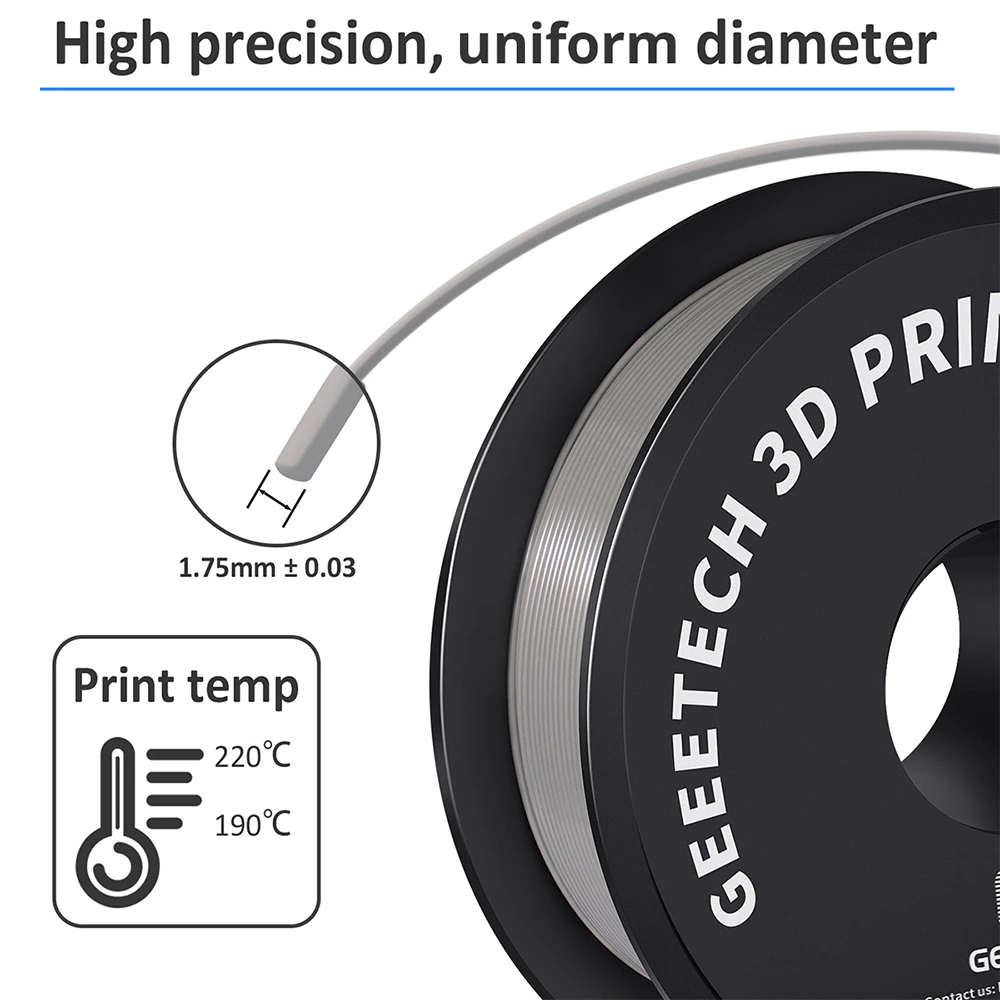 Geeetech PLA filament is clog-free and bubble-free. The recommended extrusion nozzle temperature is 195-220 Celsius, and the hotbed temperature is 55-60 Celsius.