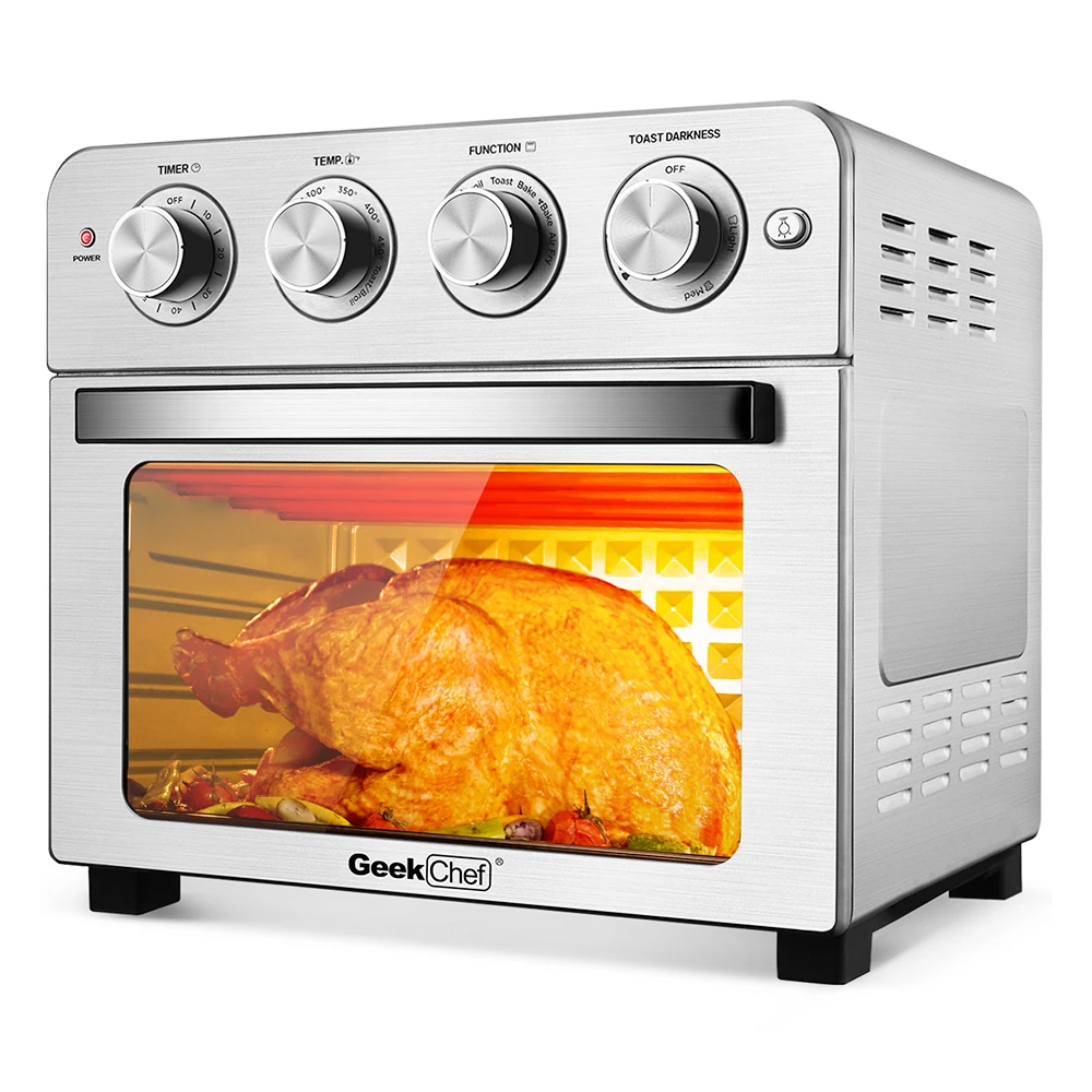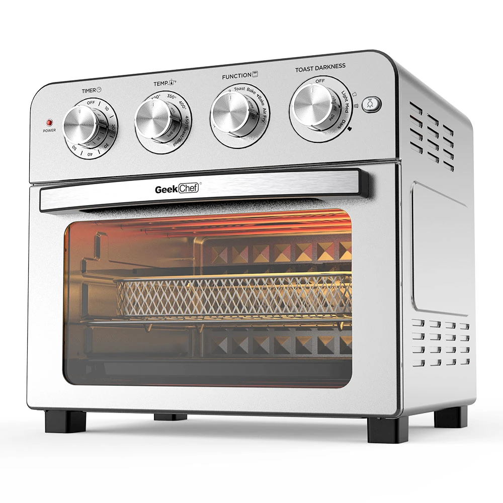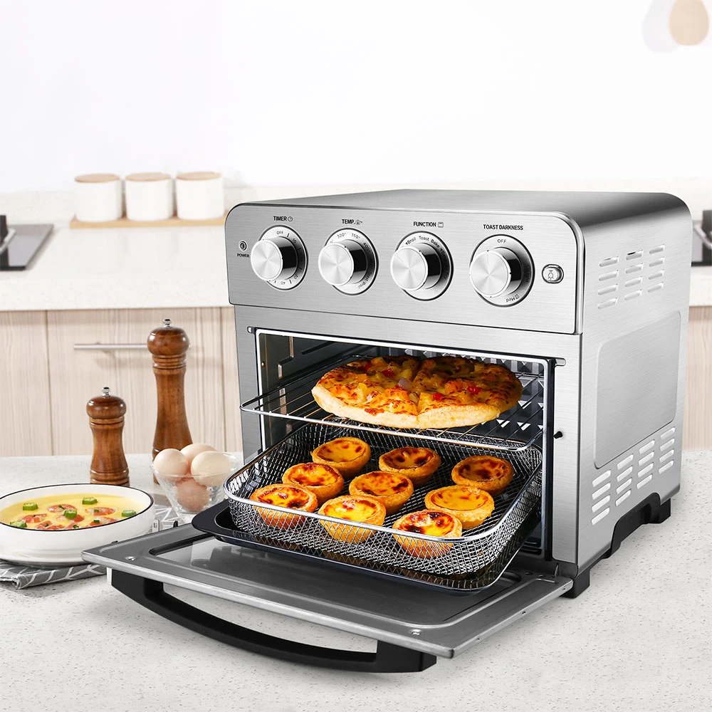 Cake/Chicken/Fish/Pizza/Steak/Toast/Wings/Cookie/Defrost/Skewer/Vegetables/French Fries/Keep Warm. The cyclone hot air circulation technology makes your food evenly cooked to achieve a crisp and delicious flavor Toaster Oven. It also adjusts the taste of the food according to your personal taste.
