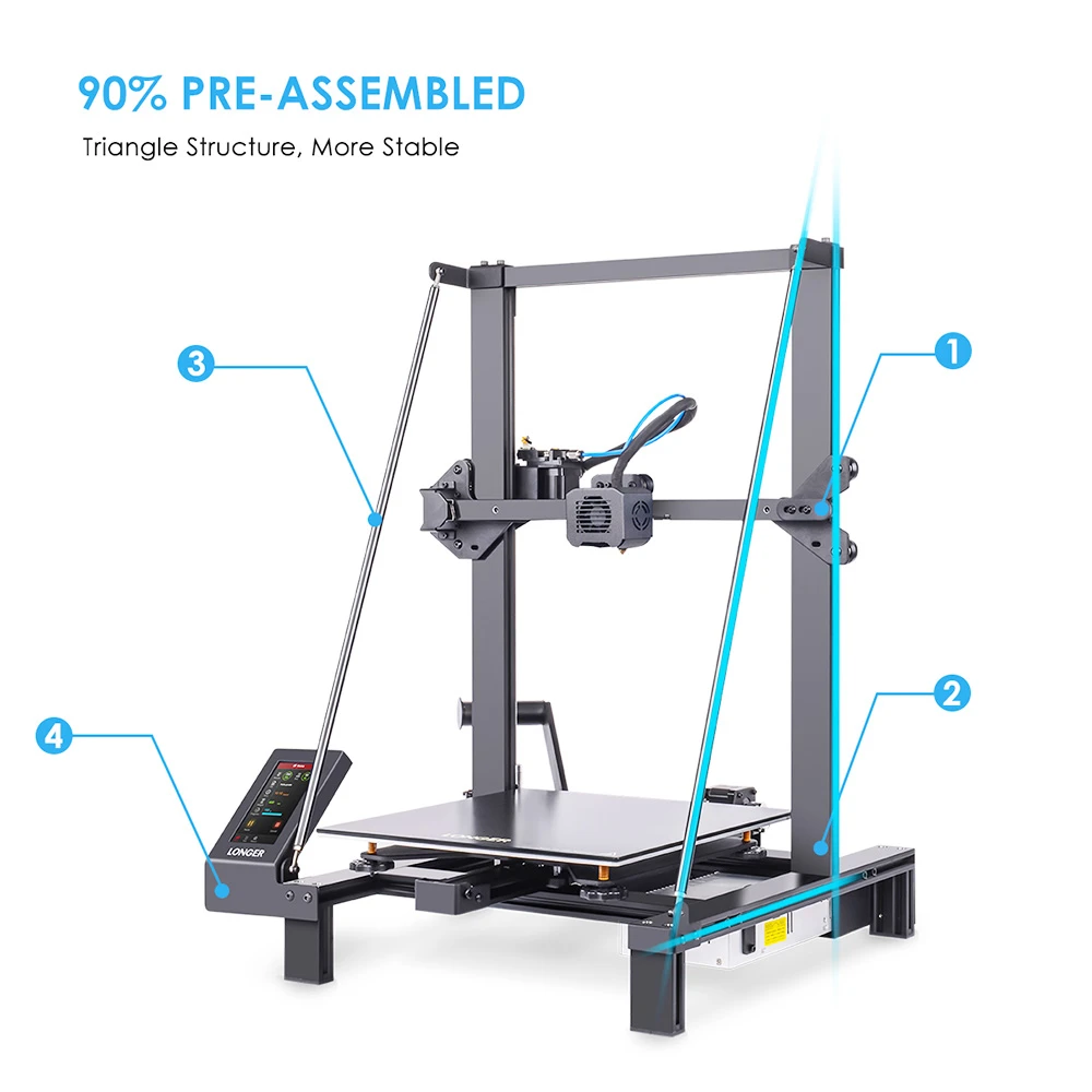 LONGER LK5 Pro is a large affordable 3d printer with 90% Pre-assembled, printing size of 300*300*400mm; With dual inlinced rods to hold z axis as a steady triangular structure for better quality of 3d printing. And it’s 90% preassembly in factory before delivery, which will be easier to assemble together and save more time.