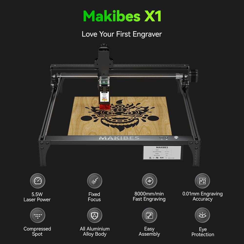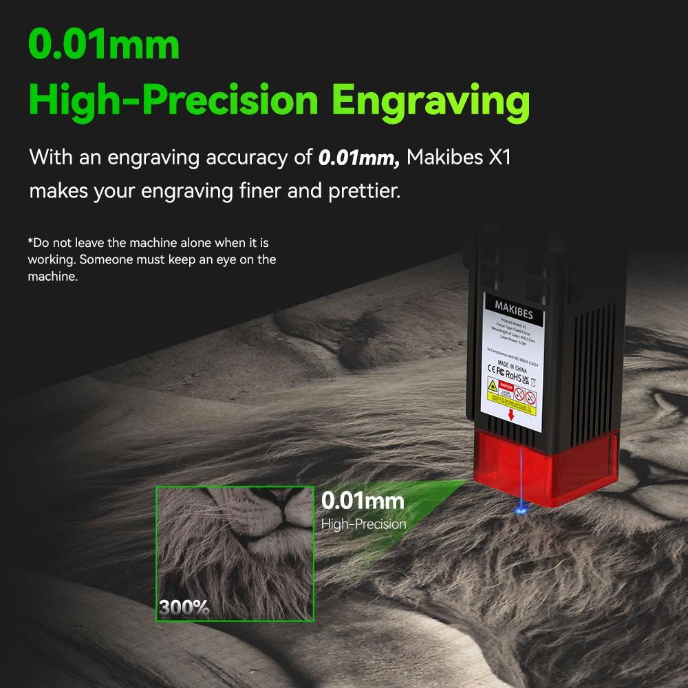 The Makibes X1 adopts a 5.5W diode laser with a small focus of 0.08mm and an engraving accuracy of 0.01mm. The small spot size, along with short pulses, produces high peak power, which can achieve more accurate and deeper engraving and cutting. It can cut a wood board with a 12mm thickness and an acrylic board with an 8mm thickness.