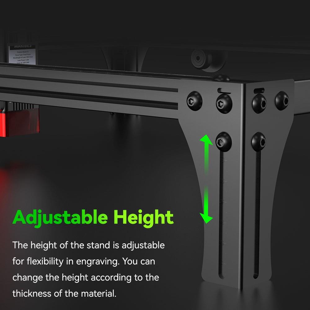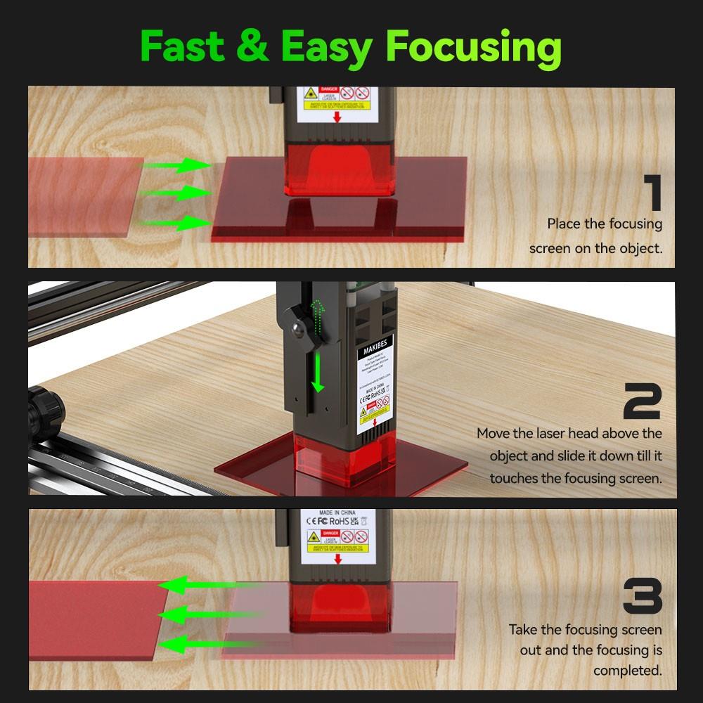 The X1 laser engraver comes with a fixed-focus laser that saves you time in adjusting the focus and a focusing screen that helps you move the laser head to the correct position. Slide down the laser head till it touches the focusing screen on the object and then remove the focusing screen.