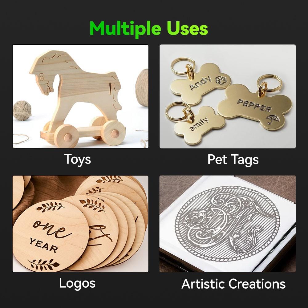 The X1 engraving machine can be used for engraving on a variety of materials, including wood, acrylic, leather, bamboo, fabric, stainless steel, etc. It is compatible with LaserGRBL (Windows only) and LightBurn (Windows & Mac OS), supporting various file formats, including JPG, PNG, DXF, TIF, PDF, SVG, AI, NC, BMP, etc.