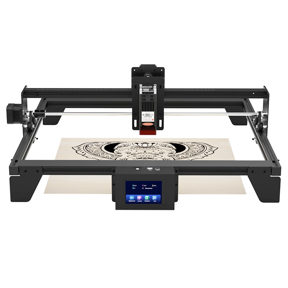 420 x 400mm large engraving area support carving various materials such as wood, plastic, paper bamboo, ox horn, leather, sponge paper, PCB board, aluminum oxide, non-reflective plating, and varnished metal. And it can be cutting paper, wood, cloth, leather as well.