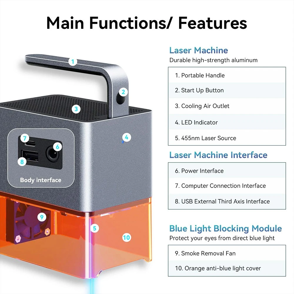 The built-in safety eye protective cover reduces harmful blue light from the laser, allowing you to safely observe the engraving process without harming your eyes when using appropriate goggles. The smoke removal fan prevents any fumes from the engraving process from affecting the final design and helps with heat dissipation.