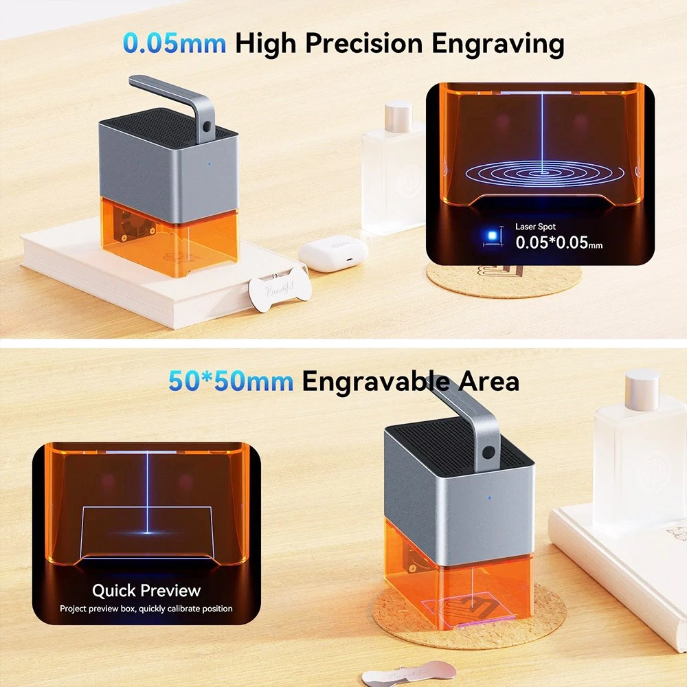 Features 4.5W laser power and 0.05mm engraving precision, it is more powerful than other portable engraving machines. Engraving materials include wood material, leather, paper material, fabric, metal, plastic, glass, ceramics, etc.