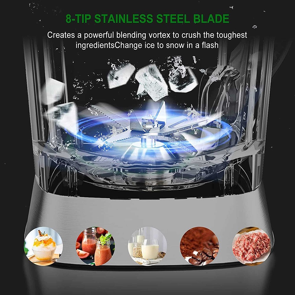 The smoothie maker with 8 hard German standard integrated stainless steel blades, which makes the blending smoother and faster. The ice and frozen fruits are crushed in a few seconds. This one blender acts as a juicer, nut grinder, coffee grinder and ice smoothies maker for multiple uses.