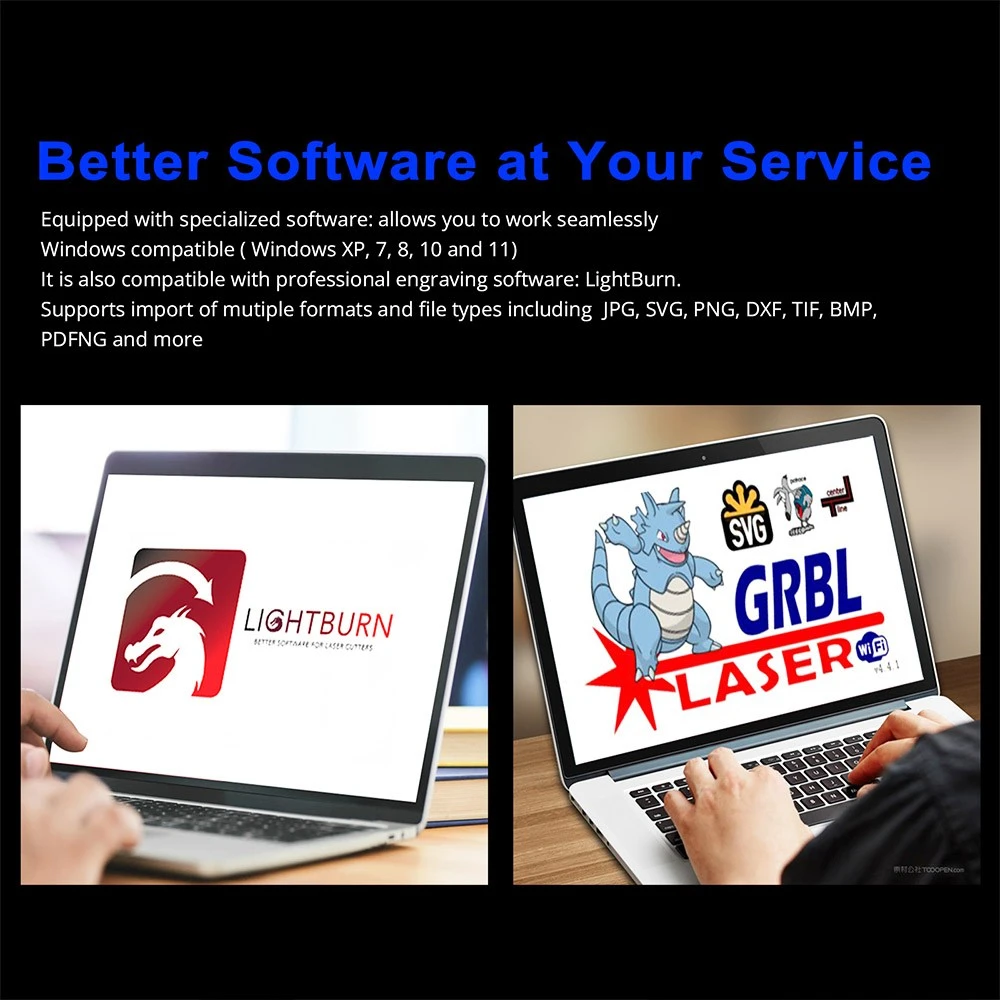 ZBAITU M81 F20 VF laser engraver can be compatible with various mature engraving software (LightBurnLaser GRBL), supports Windows XP/7/8/10/11, and also supports Mac system, engraving file format supports SVG/DXF/JPG/JPEG/PNG/BMP/TIF, etc.